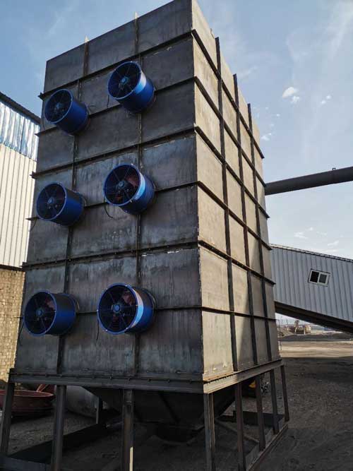 烘干后的熱蘭炭被送入蘭炭冷卻機種,然后冷風開啟對蘭炭進行均勻降溫,由于采用冷氣流的方式,降溫效率高,可在短時間內(nèi)將蘭炭從一百多度降溫至40度,這個溫度屬于蘭炭的安全溫度,可以正常的儲存和裝袋,對生產(chǎn)不造成任何影響。